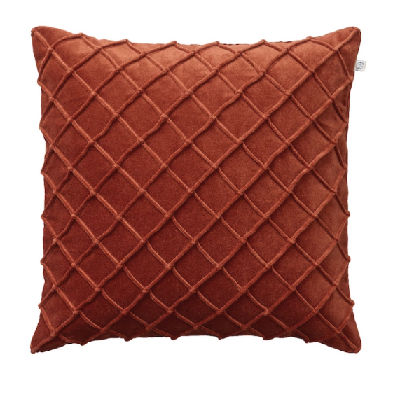 Ruosteenruskea käsinommeltu samettityyny.