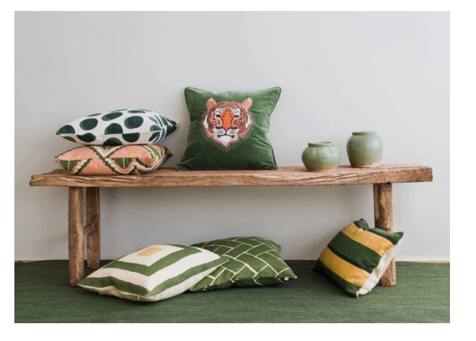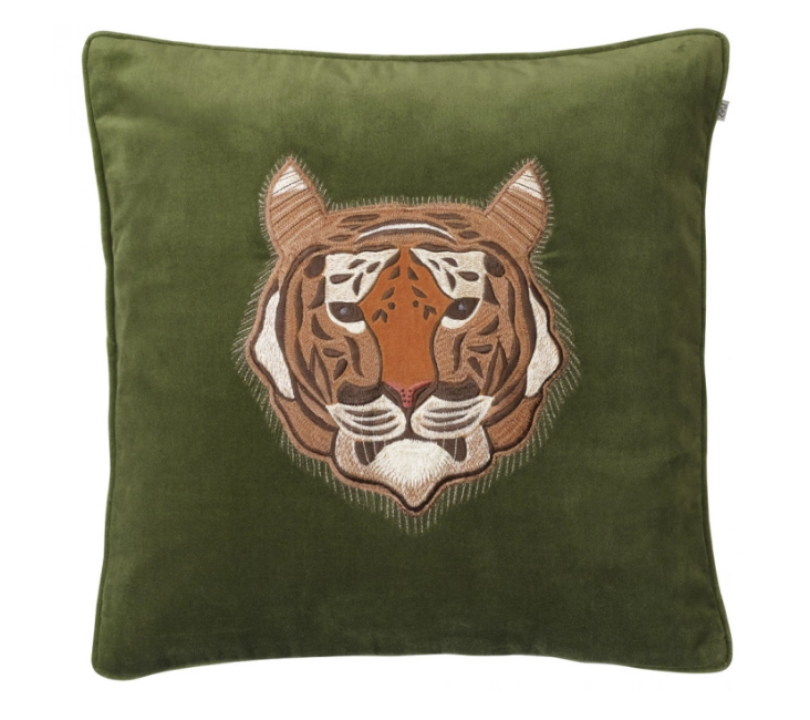 Vihreä samettityyny jossa brodeerattu tiikeri.